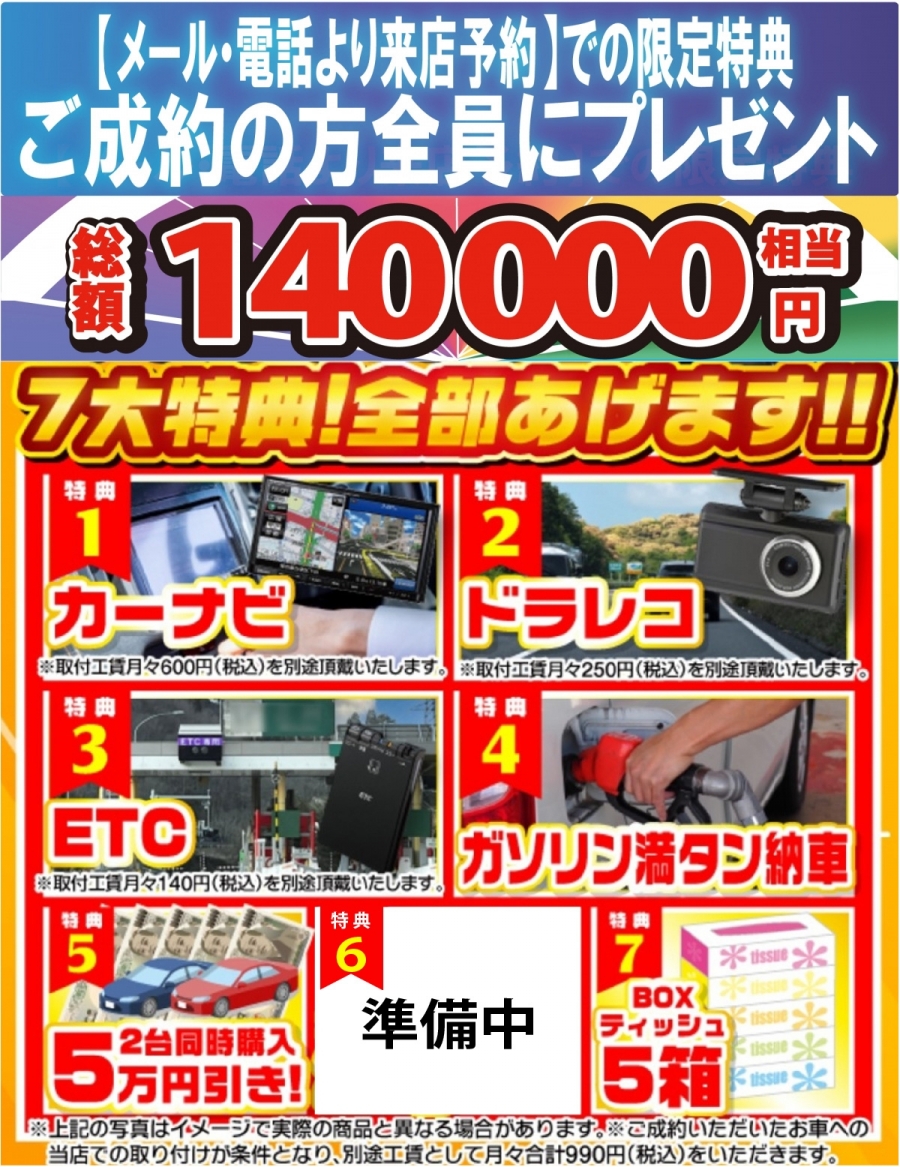 大阪市東淀川区・淀川区・吹田・豊中・箕面・茨木・尼崎・池田・伊丹・門真・守口・北区・旭区・摂津エリアのお客様に喜んで頂けるよう、事前にご来店予約を頂いたお客様限定で、「フラット7 東淀川店」のカーリースをご契約頂いた方には、ご成約特典として総額14万円相当の特典」をプレゼント!!